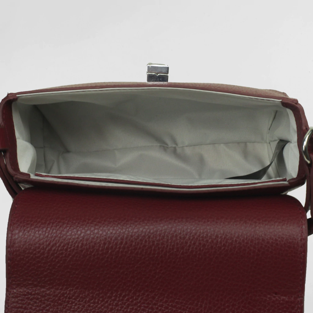 Bolsa de couro legítimo na cor Bordô, com acabamento texturizado e fecho metálico giratório.